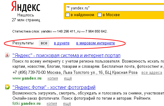 Показывать все результаты, только сайты рунета, только сайты из мирового интернета