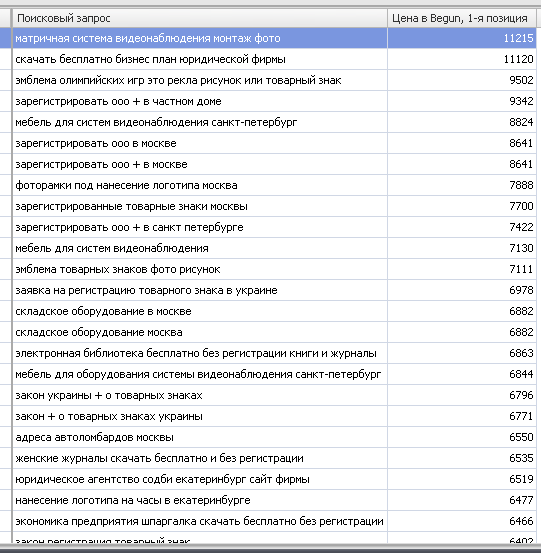 Например, можно сделать выборку по базе «самые дорогие запросы в Бегуне». Выглядит она следующим образом: